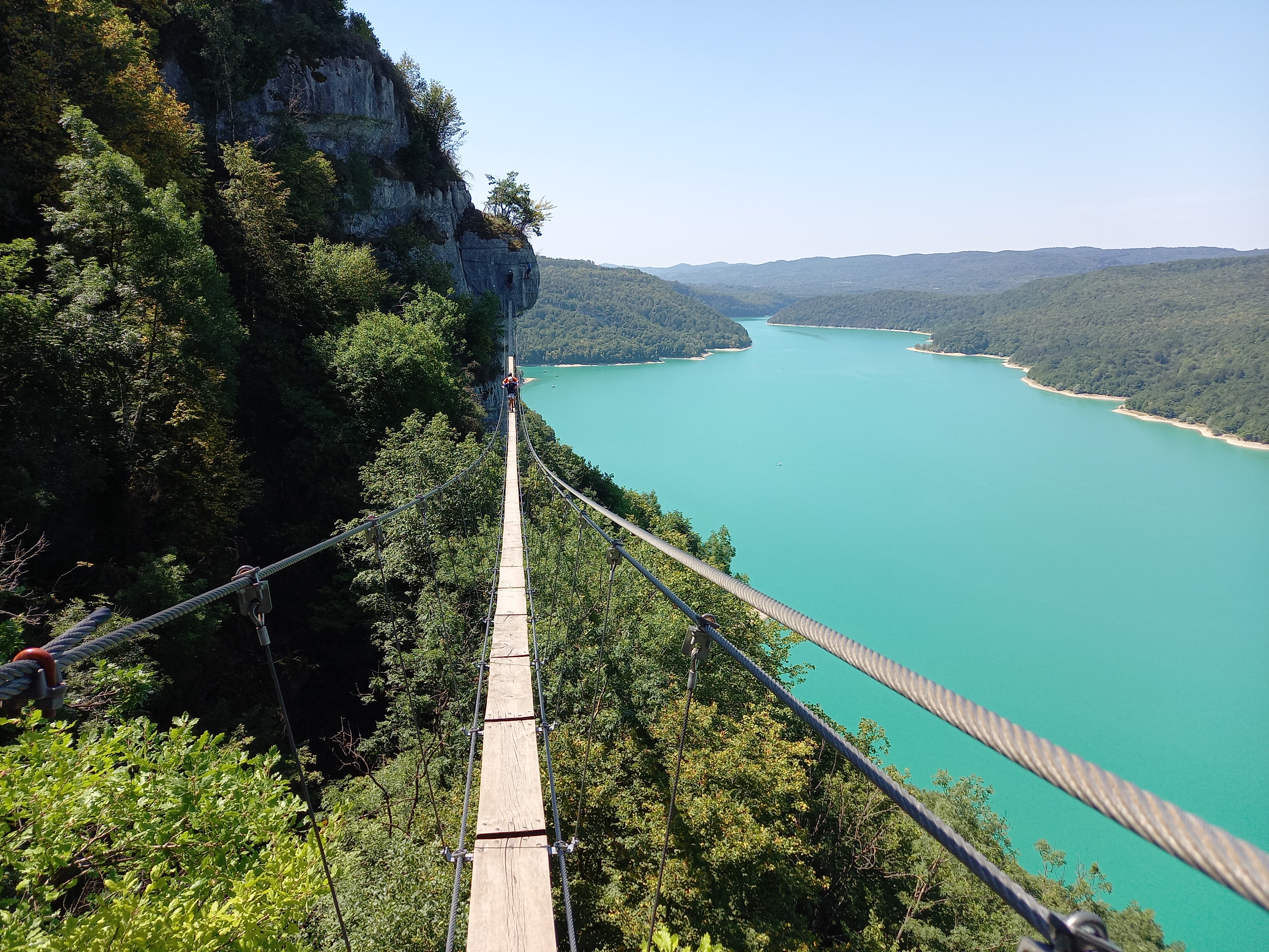 Belle vue sur le Lac de Vouglans. Certaines places/postes sont difficiles à prendre, le reste est agréable à faire. Le pont de singe et le pont suspendu sont également très beaux et définitivement recommandés aux débutants.